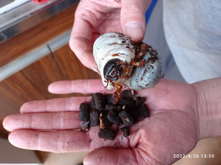 Dobrý večer, dnes při čištění chovných boxů s trop. nosorožíky. Jsem si dal trošku práce a pro ukázku vybral trus po larvách ve třetím instaru. Chystám se těmito peletkami přihnojovat orchideje a bromélie, berte to s nadsázkou je to jen pro zajímavost. Larvy jsou drženy na bukovém trouchu a listové hrabance.