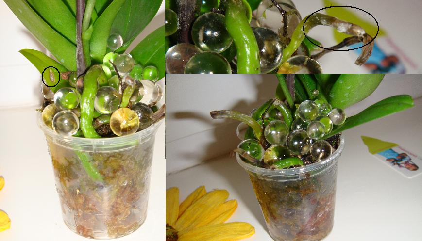 Dobrý den, včera jsem si koupila mini phalaenopsis ve skle s gelovými kuličkami ve výprodeji. Chtěla jsem se zeptat zda má být ve váze stále voda. Přijde mi, že je až moc mokrá z těch gelových kuliček a bojím se, aby ji neuhnili kořeny. Na jednom listě má dirku a na konci kořenu bílý chomáček, bojím se, že je to právě plíseň. Také jsem si všimla, že konce vyčnívajících kořenů nejsou pevné, ale seschlé. Poradí mi prosím někdo, kdo má zkušenost, zda je orchidej v pořádku nebo nějakou radu co s kořenama? Děkuji
