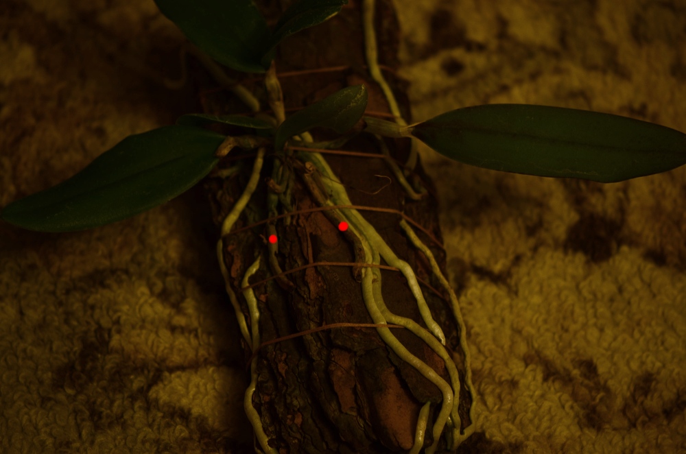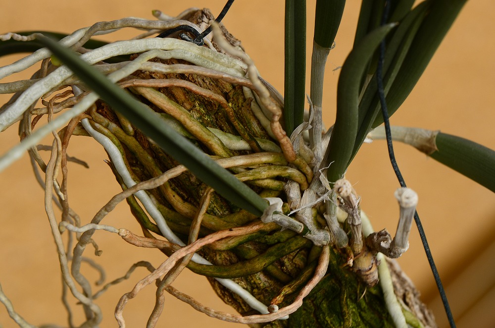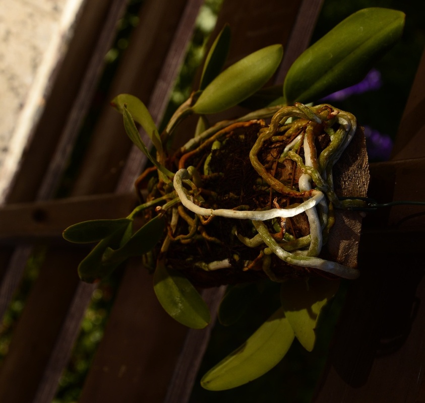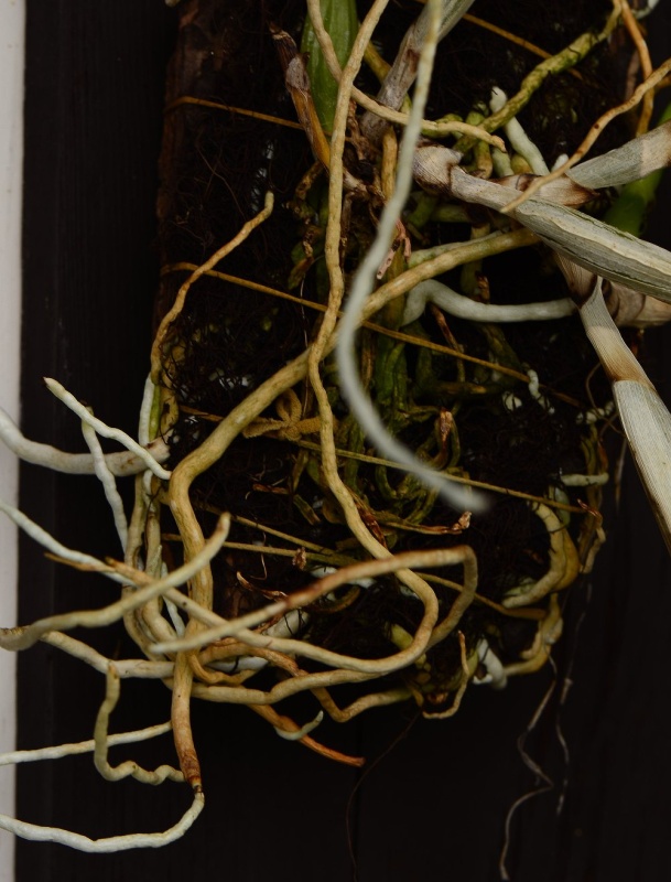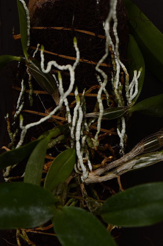 Zahradník: jaký znalec? Možná tak pozorovatel kořenů:-) Nebyl jsem v tropech, nerozumím systematice, spíš jsem si hrál se substráty. S tou zálivkou, jsem to nemyslel tak, že se stačí nějaké mlžení na list. Obecně u všech druhů je potřebná maximální saturace velamenu a pak rychlé osychání. Mě se však v praxi osvědčilo, přestřikovat kořeny nahrubo nastaveným proudem postřikovače. Ono to v podstatě stačí. Heleďte já nejsem pan pěstitel, jako třeba Míra, nebo radzák. Spíš hračička a experimentátor. Neukážu Vám stovky fotek rozkvetlých orchidejí z rozmanité sbírky. Nemám na to prostory ani peníze. O to víc jsem se ale soustředil na poznávání růstových projevů a to v nuzných podmínkách obýváku. Kupuji malé rostliny a u těch to sakra dlouho trvá, než vykvetou. Také jednostranné osvětlení značně ztěžuje pěstování. K té C. violacea na fotce. Koupil jsem ji někdy v květnu, nebo červnu a přivázal na holý modřín. Několik měsíců byla scvrklá, ale všiměte si kolik udělala kořenů. Ty červené tečky to jsou dva hlavní původní kořeny z květináče. Jsou k ničemu, i když jsou ještě stále živé. Kdysi jsem C. violaceu měl, ale uhnila právě díky rašeliníku! Také měla vira. Ascocentrum ampullaceum rovněž hodně prokořenilo a nyní se jeví skoro nezničitelné. B. nodosa zatím nekvetla, vidím to v nedostatku světla, ale je to opravdu odolná mrška. Si vemte, že mi ji prodali v čistém sphagnu. Ta směšná trochu kořenů byla pochopitelně totálně uhnilá, dokonce i část původní rostliny později uhnila. Z toho co přežilo vystartovaly kořeny nové a teď doufám je mimo nebezpečí.