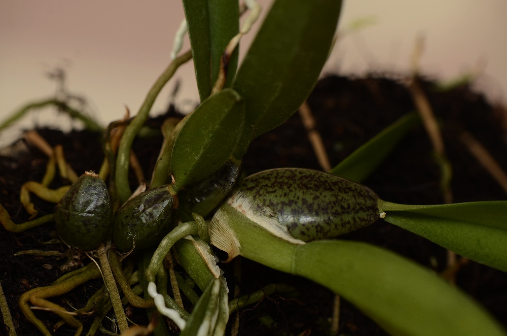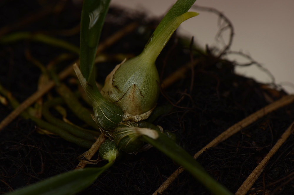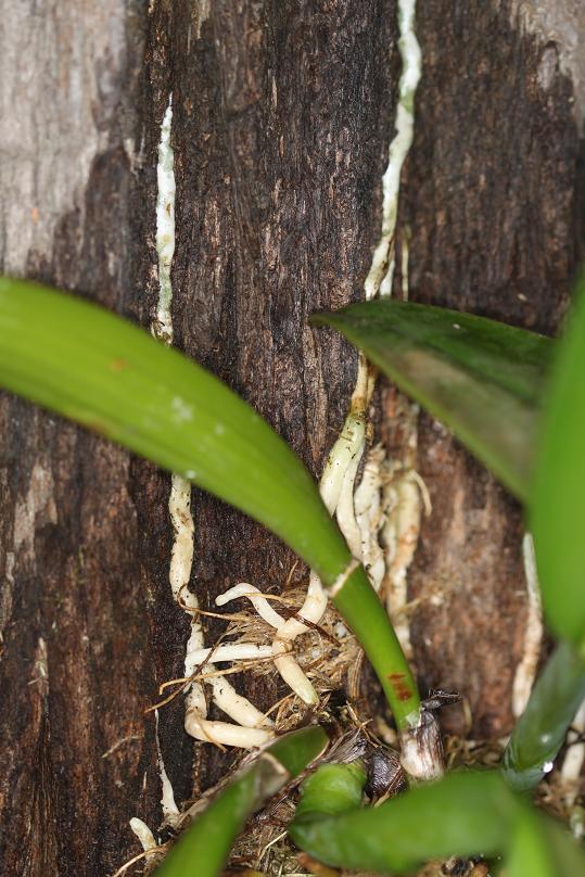 Zahradník: ta clovesia vypadá dobře. Já mám sphagnum rád a vždycky jsem měl, ale jeho vlastnosti oceňuji spíš u láčkovek, u orchidejí jsem ho vyloučil takřka úplně. Zpočátku to vždycky vypadá dobře, ale jak roky přibývají, sphagnum se kazí a na kořenech se projeví následky dlouhodobé vlhkosti. Snižuje se jejich savá funkce. Nejlíp jsou na tom kořeny, které opravdu rychle oschnou. Zaleju ráno, odpoledne už jsou kořeny v létě suché. Moje doporučení zní: zalévejte jen jednou denně a to ráno. Kdo má méně času, nemusí nutně postřikovat denně. Já postřikuji v sobotu a v neděli když jsem doma, má milá máti postříká v úterý a ve čtvrtek. Není třeba zalévat na list, stačí kořeny. Kytky bezkořenné je dobré i mlžit. Nemlžit odpoledne a na večer, pouze u chcípáků. Pozor na báze rostlin, neměly by sedět ve vlhkém mechu. Přikládám znovu foto C. maxima. Ta kytka je neuvěřitelná. Mám ji asi od roku 2007, nebo 2008 a ten modřín je těmi kořeny fakt obalen. Takový aparát se nehýčká. Vzniká tak že kytku trápíme suchem:-) Encyclii jsem si koupil jako z puberty vysněnou orchidej, za 199 od Kacerovského. Naprostá mikro rostlinka, která byla nedávno na agaru. I ta moji suchou kulturu snáší dobře, podívejte na a poslední pahlízku co u nás narostla. To samé Oncídium onustum. To je obzvlášť tvrďák, rostoucí v přírodě i na kaktusech. To se misí zalévat opatrně.