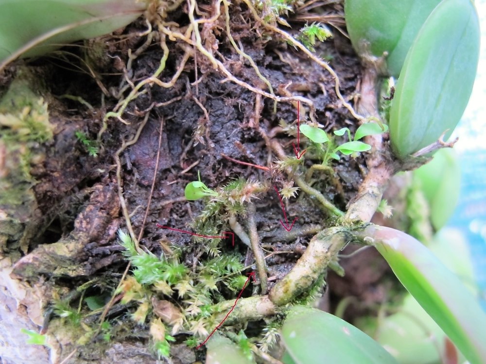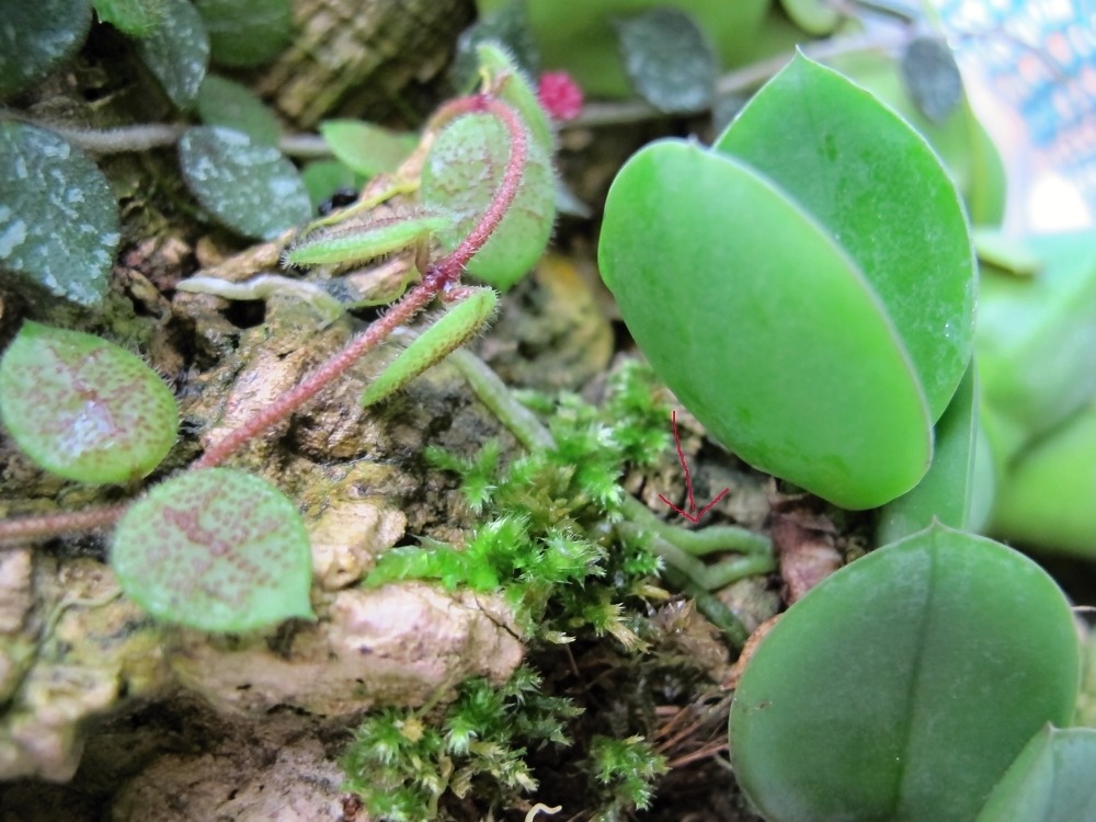 Karlos píše: Meiracyllium má tak citlivé kořeny, že i trocha sphagna jiim škodila! . Pop tíhou tvých krásných kořenů jsem šla propátrat moje Meiracilium trinasutum.Otrhala jsem mech a posílám foto(označeno šipkami ostatní kořeny jsou Dischidie )-kořeny tam jsou ale zdají se mě slabší než v části kde Meiracilium už přerostlo z dosahu mechu.Tam jich je na jednom místě víc -vidíš jeví se to jako lepší varianta.Tak to tak nechám. Zapoměla jsem dodat -a ještě ti tvoje Meiracilium pokvete .