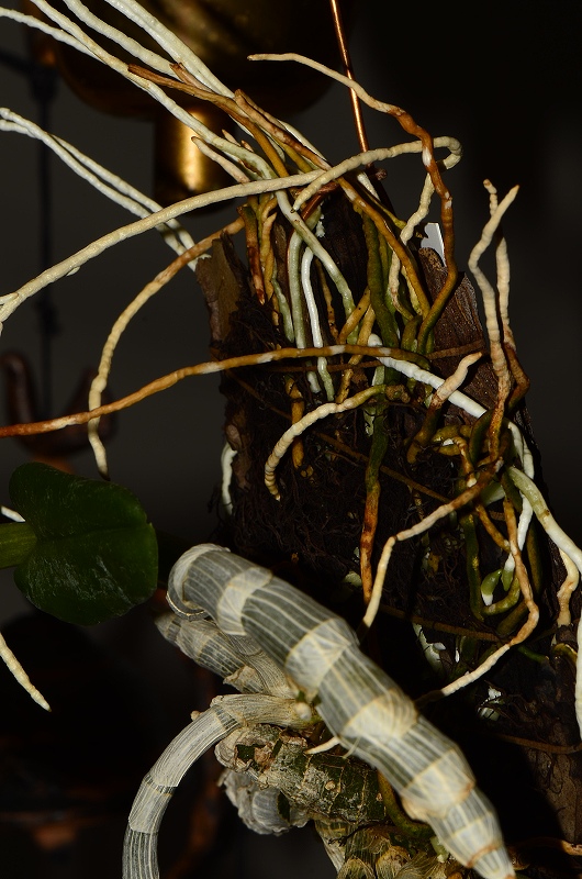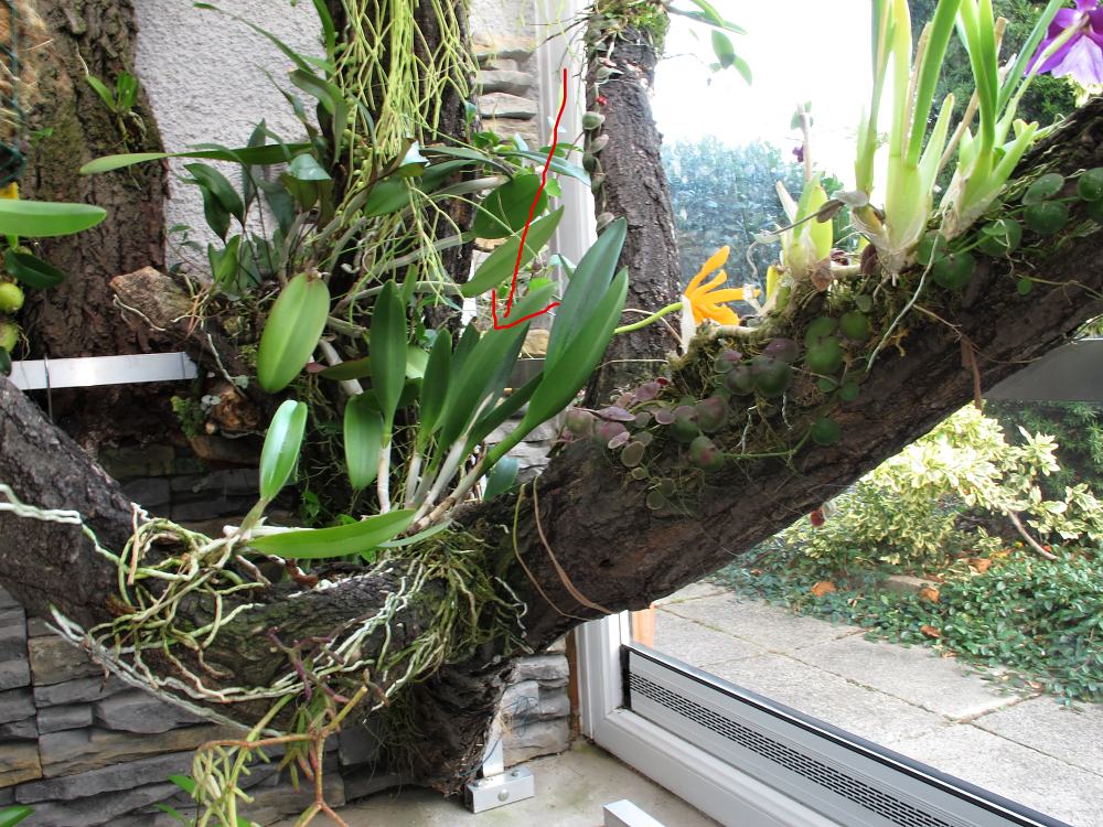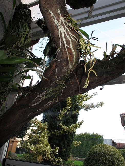 CHci vám taky ukázat svoje kořeny i když je to ze skleníku Brassocattleya- přesný název nemám ani nebudu mít ale to neva. Tak ty kořeny .Brassocattleya je navázaná na akátovou větev kořeny zalezly pod tu větev kde vůbec nerosím. A jsou tam hezčí než nahoře a srandovní tím růstem úplně jinam než bylo naplánováno
