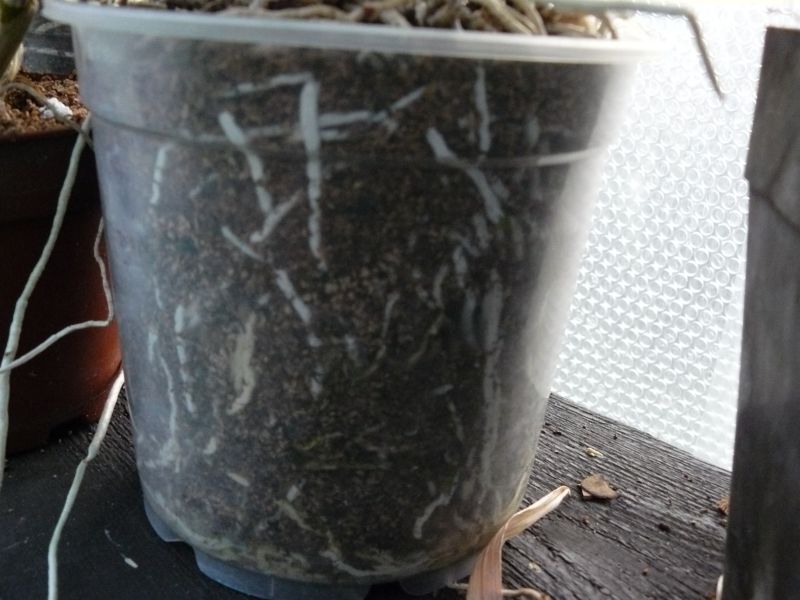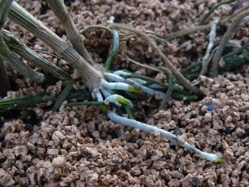 Takže podle slibu zasílám fota substrátu z korku. 1. substrát, 2. hloubka zasazení Dendrobia, 3. nové kořenění a prokořenění květináče díky malé vlhkosti. Po zasázení to chce jen zalít ale ne namočit. Nechat úplně vyschnout a potom běžně zalívat ne máčet tak 1x za týden. Jakmile prorostou kořeny do substrátu pozorovat staré pahlízy, aby se nescvrkávaly. Pokud by se během léta toto dělo, mohu nepatrně ještě cvrknout v půlce týdne ale opravdu cvrknout. Pokud se neudržíte ( je to těžké, protože obzvláště v průhledném květináči je vidět to sucho) tak dojde k tomu, že i korek nasaje a dole tak do jedné třetiny bude přemokřený (zmavě hnědý) a kořeny začnou zahnívat. Věřte, že suššeji Dendrobiím vyhovuje a rostou jako z praku, protoře květináč je narvaný kořeny, které zužitkují každou kapičku.