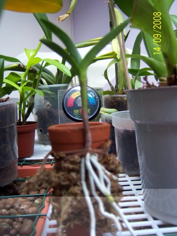 taky řeším tento problém. Navíc jsem získala několik dendrobií navázaných na podložkách se slovy " na jaře je zasaď do květináčů, půjdou lépe" Ale co do jara ? Zkusila jsem toto: plastové kelímky z lahůdkářství - většinou jsem použila tak půlku, udělala hodně děr po celém kelínku, přidala trocho coco chipsů s jemným chipsem a tím přikryla kořeny (dost na volno, žádné pěchování), přetáhla punčochou a navrch dala pytlovinu (aby nebyl vidět kelímek a punčocha). Žádná velká krása to není, ale účel to splňuje - trochu vlhkosti u kořenů, dost děr - takže přístup vzduchu a namáčím tak za 3 dny. Na druhé fotce je zřejmě to, o čem mluvil Virens - neglazovaný mini květináček (průměr 4 cm nahoře, výška 8 cm), je na něm navázané Epidendrum (oddělená keiki) a docela se mu to líbí. Voda vydrží min. 3 dny, kořeny rostou krásně a již má i nový list . Květináčky jsem koupila v kutilských potřebách (keramika, malování atd.) - používají to na nějaké panáčky a hlavně - nemá to dole dirku