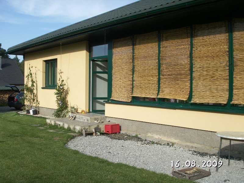 Tak teď ti už rozumím Ty rohože mají asi jednu nevýhodu rostliny mohou mít málo světla .Napadla mě taková blbost-něco jako markýzu ale vyplnit stínovkou  Automatika by byla možná no ale to by bylo hodně peněz .Jinak baráček pěknej. Na ty fotky jsem zvědavá jak to máš uvnitř . Mohu se zeptat kolik jsi tam měla v létě nejvyšší teplotu- zase ta střecha ti teplotu může srazit. A jak si na tom z vlhkostí.Ty okna jsou dřevěný asi? Znám pána který má něco podobného. Ale má ve střeše okna a tu stínovku na sklech.