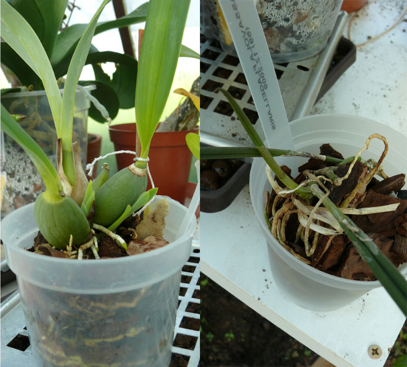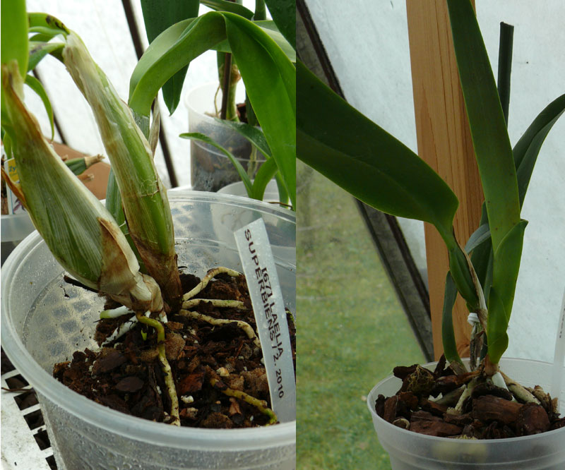 Laelie řadím také k pomale rostoucím, takže přírůstky nejsou šokující, nicméně laelia superbiens má také již téměř se oddělující novou pahlízu - bohužel se mi ji nepovedlo dobře vyfotit.
