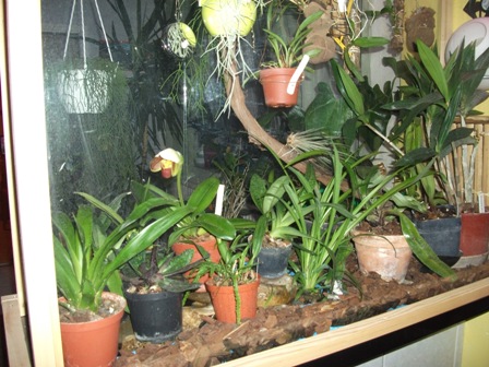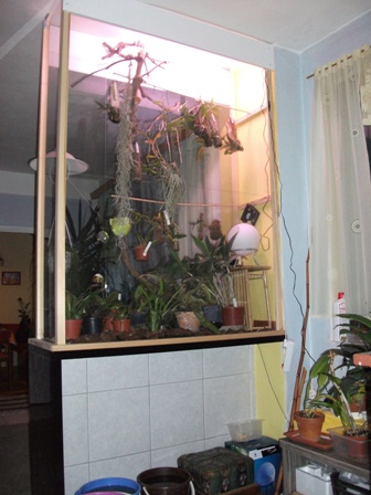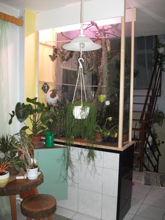 ivag, problém vysokých vitrin je tma dole. Já vždycky doporučuji (i když se zdá, že to svítí do očí) svislé zářivky do každého rohu vitriny. Je tam i pro kytky dole dostatek světla. Dají se koupit vodotěsné a nesmí sahat až dolů ale nejlépe tak 5-10 cm od spodu. Rohy se dají mírně rozšířit nalepením lesklé hliníkové folie z venku nebo zevnitř aby to nesvítilo do očí. Ty protější jsou už mírně zastíněny rostlinami.