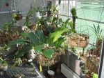 Tak dáme zase něco o pěstování  . Jak je u Vás skleníkářů a zimníkářů zahrad po zimním období? Můžeme už bilancovat. U mě takto.Vše přežilo –uvědomuju si zároveň že u jistých rodů je tohle tvrzení takové drsně odvážné………. Pro tento rok dám změnu .Ze zimního pobytu v rohu Zz kde je nejvíc světla (ale ještě jsem přisvětlovala) jdou střevíce na jiné místo,kde ještě rostliny nebyly .Je tam ranní světlo a ze střechy makrolonu jde zvláštně rozptýlené světlo-to se mě zdá dobrý-snad lépe porostou . V létě tam půjde i odpolední světlo až bude slunko výš - mohlo by to být snad ok. Zelenolistý velkokvětý jsou také dole u mřížky která je v létě otevřená. První zimu nemám listy u Stanhopejí flekatý –potěšující - v mém zimním poklesu k 13°C jsem moc nezalévala. No už mám stínovku na střeše(32°C už jsem v Zz měla) ,a v záběru ten kbelíček - je naplněn kravincem. Takže už víte že hnojím. Je to tak- ač se snažíte sebevíc ve skleníku uklidit -něco se do záběru vždy propašuje.Takže 3x hurá zima už je v tahu.  Na fotu jsou také žaluzie- ty teplotu nesrazí –ale používám je(když už je mám) hlavně než dám trvale stínovku.