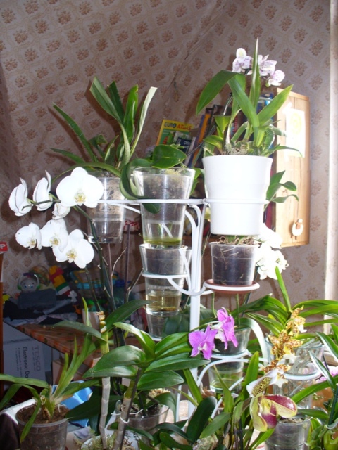 Ahojky.Dneska jsem od manzela dostala definitivni stojanek na orchidejky-ma 8 kruhu do kterych se mi vejdou orchidejky i v obalu  . Je bily a hodne vysoky.Je na stolku a usetril jeste vic mista-ma 3 patra.Tak uvidime jak se tam holkam bude libit.Mozna to jeste trochu poprehazim.No radost udelal-a to zatloukal,ze nebude.