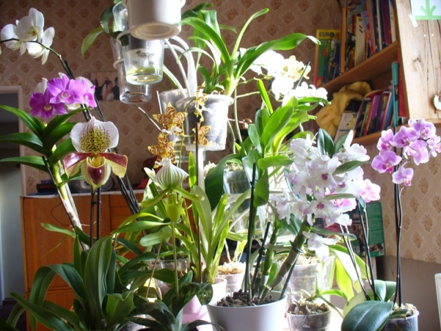 No,ted jak mam stojanek,tak je na ne lepsi vyhled.Jo jsou na tomhle stole,skrini a jeste v jednom pokoji pod stresnim oknem a ruzne,kde se da.Taky mam faliky u rodicu a netere.Tady je muj ranni pohled z postele-krasa.Kdyz si odpoledne ctu,tak se kocham.Akorad vetsina to neni moje kveteni a za par mesicu bude po tom.Spoleham ale na leto,ze neco vyhodi vyhon.Nejvic spoleham na lonskou Vandu Sainsai blue 3n.Zasadila jsem ji do te kury a jde na ni pekne slunicko,tak snad se holka bude snazit.No a uz pre rok cekam na ruzovobily strevic.Porad tvori jeste ty tygrovane listky,ktere rostou,ale jde mu to lumpovi pomalu.Ale jestli se dockam,tak pokvete z dvou ruzic soucasne,takze snad z kazde aspon 2 kvety.Jinak klasika falenaky.Uvidime jesli Brassie z lonska neco utvori-novou pahlizu ma peknou,ale nic,tak kdyz ted bude vic slunicka a je vysoko naproti oknu na tom velkem stojanku,tak snad neco podnikne.At vam to pekne kvete.
