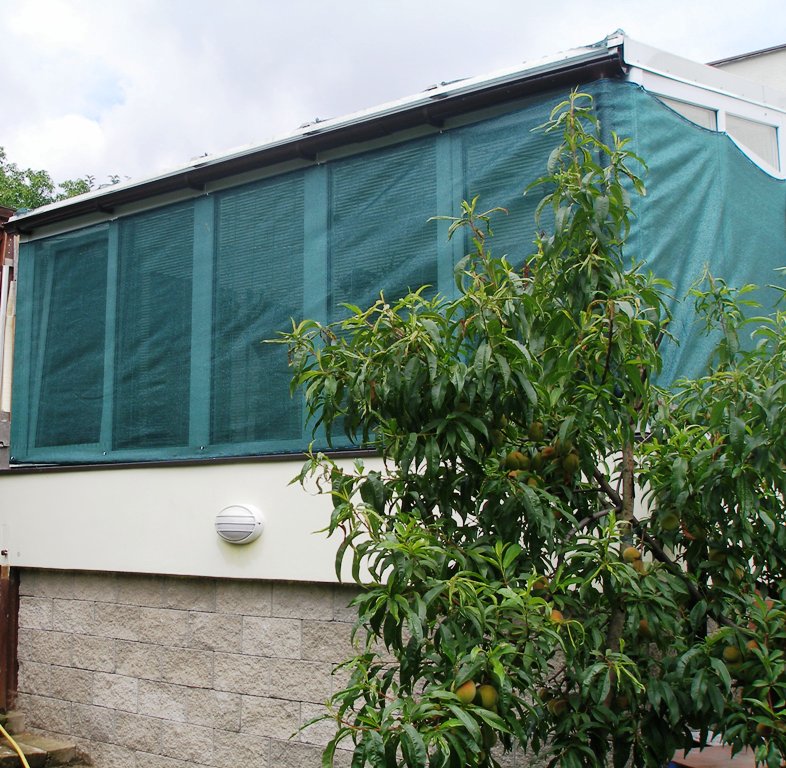 Tak už mám konečně správnou síť a je zavěšena přes okna. Žádná paráda, ale snad to pomůže. Pokud by to bylo málo, můžeme přidat ještě jednu 50% síť na střechu. Mám ji připravenou, tak uvidím až bude horko, jak to bude vypadat