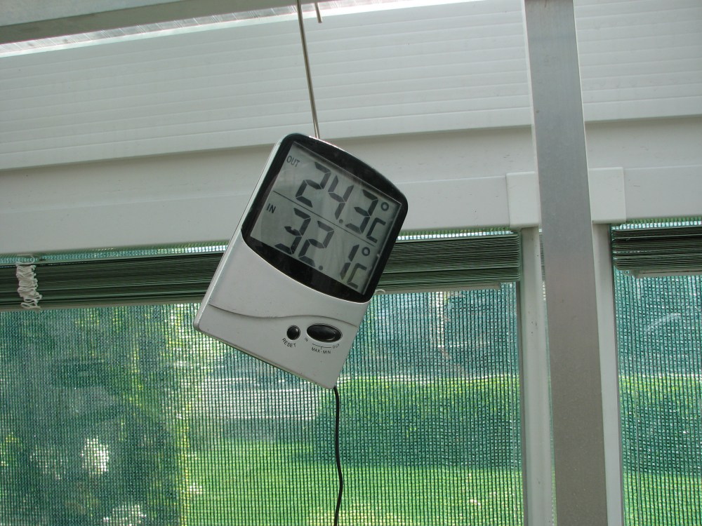 Dneska bylo přes poledne opravdu teplo a tak jsem kontrolovala teplotu na různých místech. U oken po zavěšení 70% stínovky bylo 26°C a na druhé straně pouze pod 50% stínovkou na střešním makrolonu bylo 37°C. Tak tedy zítra ještě dáme na střechu druhou 50% síť. Uvidím, jak se to změní.