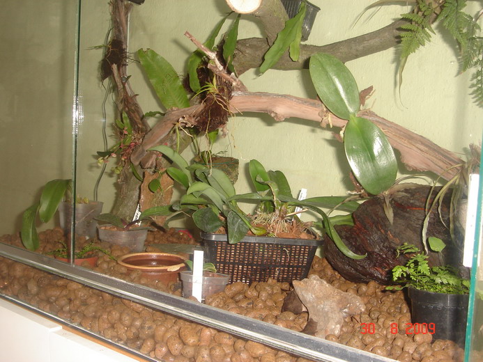 už jsem to nemohla vydržet, měla jsem nějaké rostliny a strach,že mi zajdou,pozadí které se jen někde trochu slouplo mi vadilo, mrkla jsem k Jurasovi,ten tam taky nic něměl, sice ji má jako dělící stěnu a tak jsem začala.....teď mě čeká rosení? Jak často.... musím koupit spínací hodiny na ten větráček(stačí jeden?).....a tu malou fontánku z kamene,kde přes něj poteče voda...(to snad zmáknu) a osvětlení- to bude maturita jestli zářivku nebo nějaký reflektor....a budu to brát i tak chybami se člověk učí...Mám ještě Aeragis spiculata(v květináčku), je pěkně usazený, a zvrchu nevím jak zavěsit - háčky na přísavku?