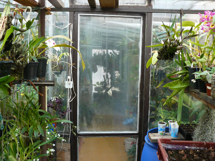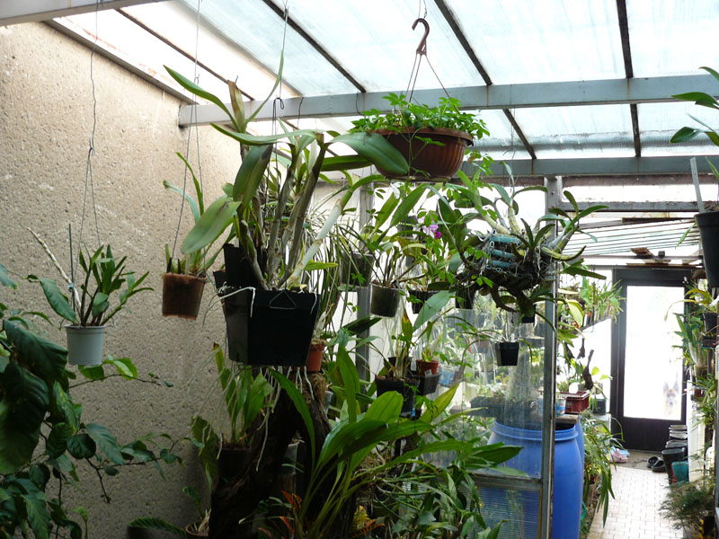 Já jsem se do toho pustil v roce 1980 kdy nebyly ani knížky o orchidejích natož zkušenosti nebo fóra. Prostě jsem jel podle citu a tehdejších finančních možností a také možností materiálových. Protože mám domek tvaru U směr plný jih, tak jsem uvažoval o zastřešení átria. To je uděláno jako sice lehká ale velice pevná konstrukce, kdy jsem do obvodových zdí vetkl jäkly 90x40 se středními podporami a na vrch navařil T kusy 20x15mm. Toto bylo zaskleno 5mm tlustým sklem. Přední stěna dřevěná konstrukce se spodními ventilacemi. I ve stropě byly na dvou místech ventilační otvory, které jsem pak stejně zrušil kvůli tomu, že odvětrávali ve vedrech tolik potřebnou vzdušnou vlhkost. Stíníl jsem vápenným mlékem nebo modrým nástřikem co používali zadradníci ale na podzim lézt na střechu a vše smývat nebyla sranda. Obrázky 1 a 2. Pak jsem rozšířil sbírku a rozhodl se vyjet z átria ven ale přemýšlel jsem jak na to, protože druhé oddělení jsem chtěl chladné. Klasický skleník se mi nelíbil a hlavně jsem potřeboval ušetřit na topení, takže jsem druhý skleník udělal tak, že jsem vlastně vyzdil zídky do výše 50cm a nahoru pokračoval jen sloupky, mezi kterými byla okna 150x150cm výklopná. Přední stěna opět dřevěnná a vše opět 5mm sklo. Časem ale okna odešla, protože tehdy ta okna byla dělána nekonečným programem, takže byla slepena z kousků, které se ve vlhku začala rozpadat. V té době začal makrolon, takže jsem do původních okenních rámů udělal vložky s makrolonem a to tak, aby šly vyklápět a to tak, že do kříže. Druhou dvojici opět do kříže už jsem řešil tak, že přímo na rámech je těsnění a makrolon je tam napevno přes přítlačné lišty. Větrání se při zvyšující teplotě na jaře provádí tak, že ta dvě okna do kříže se přes den otevírají a na noc zavírají. Jakmile ale teploty stoupnou na stálou teplotu +10°C v noci tak zůstávají otevřená a navíc oddělám i makrolon z těch zbývajících dvou oken, takže vznikne jen podoba "japanu" kdy jsou boky zcela otevřené a nad rostlinami je jen střecha. V původním atriovém skleníku bylo osvětlení jen vrchem a přední stěnou. K tomu přibyla další vrstva makrolonu ze střechy navazujícího skleníku takže bývalá venkovní stěna je vlastně dělící stěnou mezi teplým a chladným skleníkem. Podotýkám, že to vše je od roku 1980 a rostliny si naprosto nestěžují na nedostatek světla a to ani v zimě. Nepřisvětluji a nemám problémy. Přes léto stíním stínovkou o hustotě 70%. Větrání skleník v původní átriu zajišťuje velký ventilátor, který jed dvakrát denně ale hlavně přes největší parno tedy od 11 do 15 hodin. Jo ještě abych nezapoměl. Zdivo skleníku kterým jsem vyjel ven je zevnitř kryto 1cm polystyrenem a z venku 5cm polystyrenem.