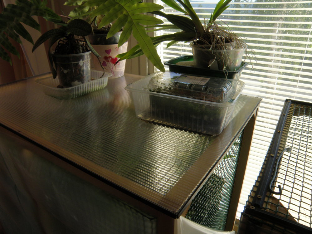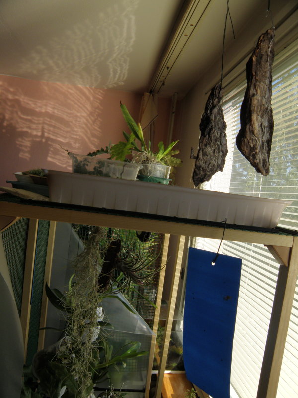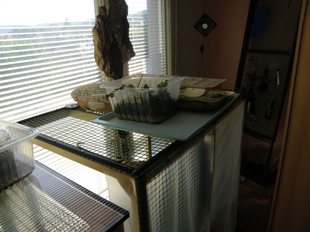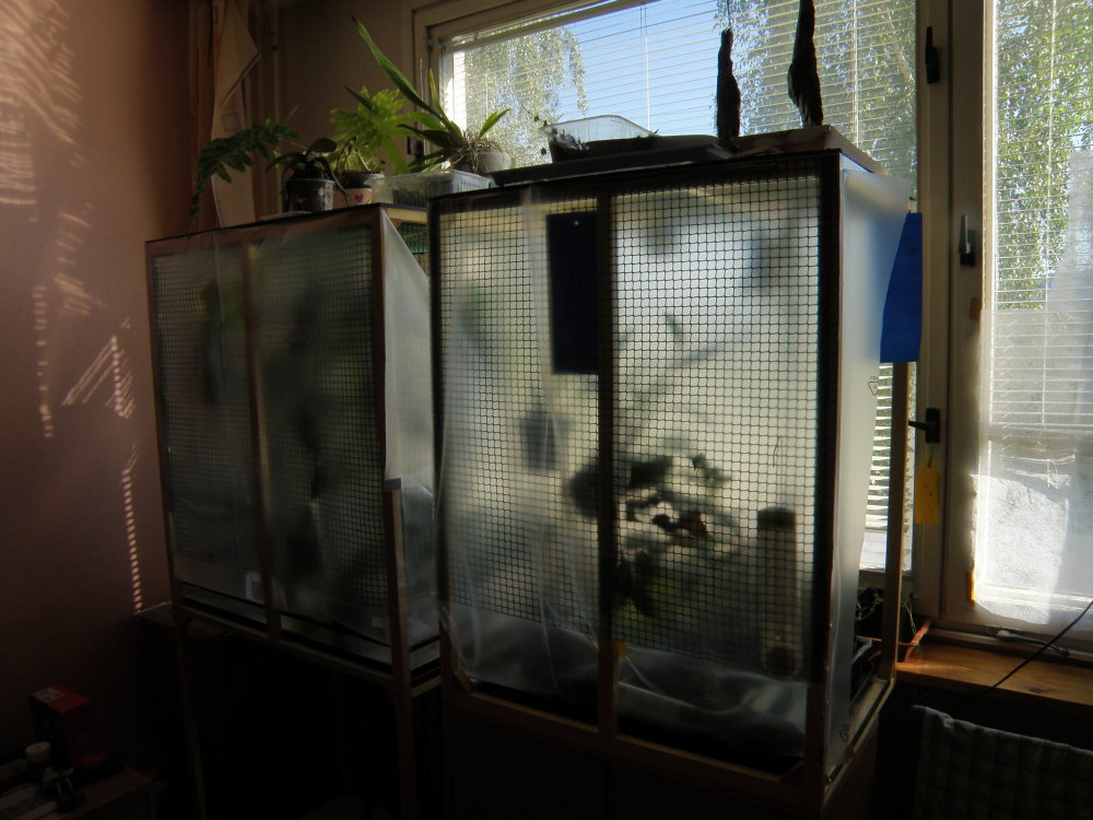 Jelikož se kvapem blíží výměna oken dobrá stará dřevěná přijdou nahradit plastovými :cry: , jsem byl nucen rozebrat celou konstrukci zabírající celou plochu okna a nahradit ji novými vitrínami, které jsem navrhnul tak, aby byly mobilní (jsou tudíž opatřeny kolečky), aby šlo rostliny postřikovat a zalévat bez stříkání na nová okna ale zároveň byl ponechán stávající, ne-li větší pěstební prostor, zachováno dobré proudění vzduchu-což beru jako prioritu, vzhledem k požadavku častému postřiku a přitom zdravému rychlému oschnutí. Vznikla tedy tato dvě monstra ;) 8-) která jsou teprve ve fázi testování, ale budiž inspirací k vyřešení případně obdobných problémů s nedostatkem pěstebního místa přímo na parapetu.