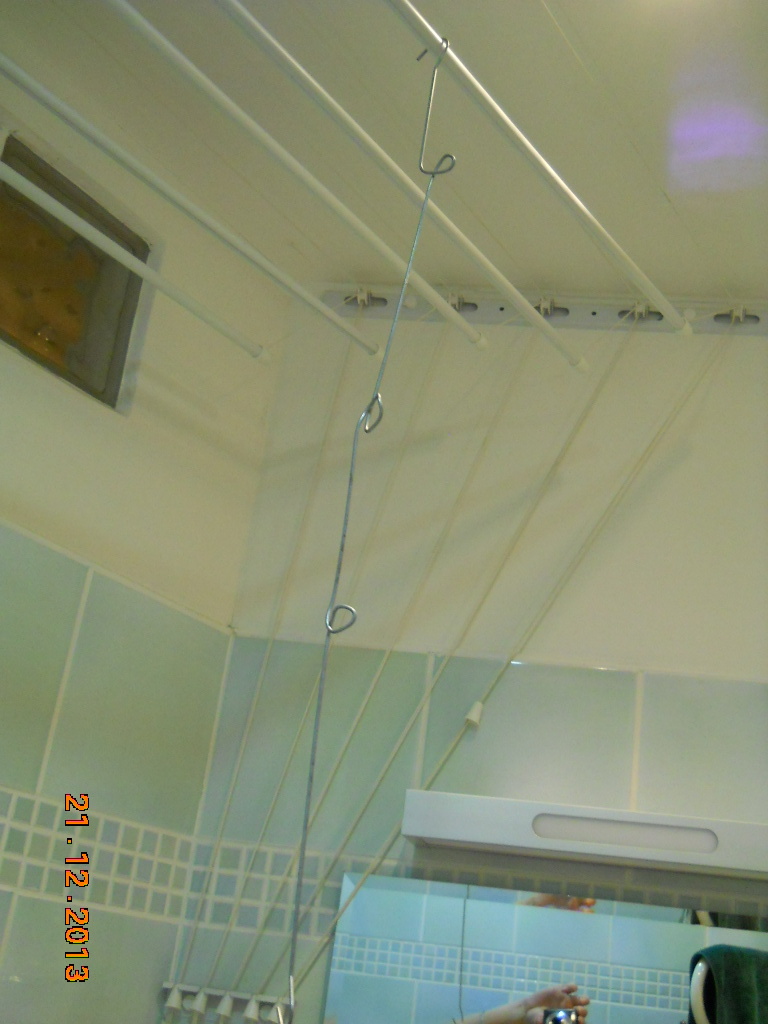 Dovolím si na podobné téma - závěs, který používám já. Výhodou tohoto řešení je to, že ho sundá i osoba nižší postavy, není nutné ho sejmout za vršek, může se uchopit i v dolní polovině a jde sejmout i pověsit zpátky. Nevýhodou je to, že zavěsíte jen tolik kytek, kolik si naděláte oček. Ale ono se jich tam stejně moc dát nedá, rozestupy být musí.