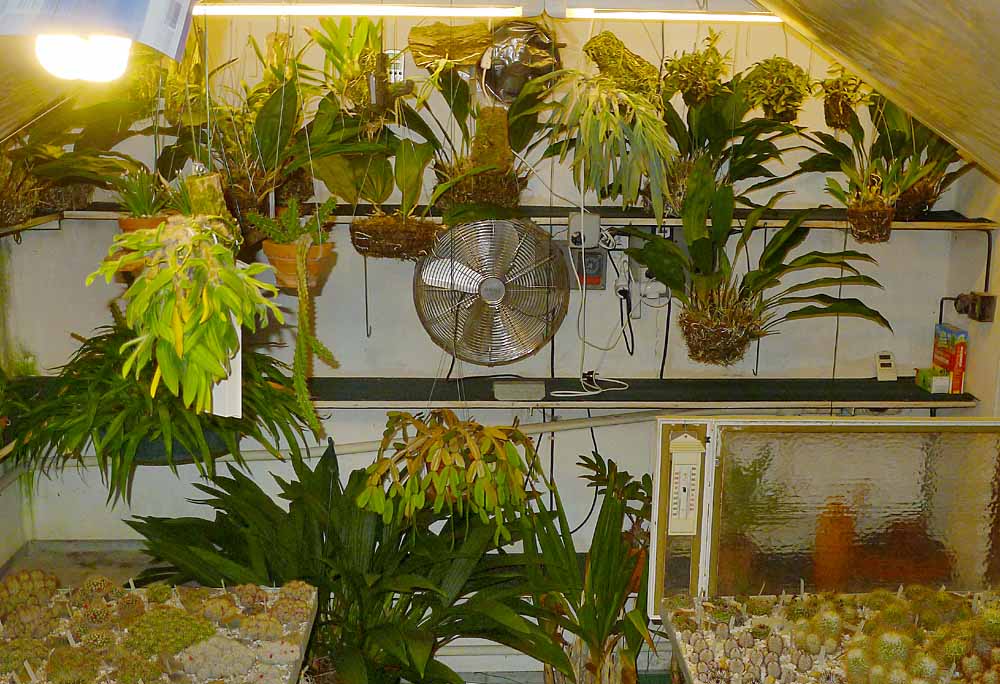 zimování je vždy problém. Hlavně se světlem. Ve studené části přisvětluji, hlavně kvůli cuthbertsonii. V temperované a teplé části si musí vystačit se světlem tak, jak je. S teplotou to mám obráceně díky podlahovému vytápění, nejtepleji mám u země, kde je také největší tma (skleník je částečně zapuštěný do země)