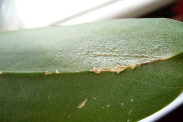 tohle mam na jednom phalu taky. dela se to na listech samo od sebe. neni to zpusobene mechanickym poskozenim. treba naroste novy list a najednou se na nech udelaji tyhle veci.