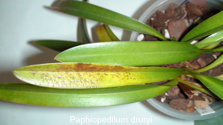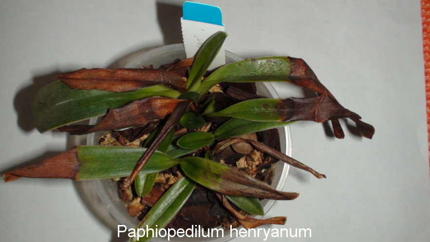 Petr48, Paph. druryi je jedno ze špatně pěstovatelných střevíců. U mne trpělo velkým nočním poklesem teplot v zimě. Dlouho jsem pátral jak jej donutit dobře růst. O květu jsem vůbec neuvažoval. Až v době internetu když jsem už Paph. druryi a Phal. giganteum daroval byly informace jak Paph. druryi pěstovat. Někde jsem se dočetl, že základem je u tohoto druhu jemnější substrát s podílem rašeliníku plus vápenec ale dobrou drenáží. Doporučovali keramický květináč. Je známý špatnou tvorbou kořenů. A myslím, že ten váš kořeny moc nemá. Pak se objevují různé choroby které souvisejí přímo se stavem rostliny. Myslím si, že Paph. henryanum také nemá kořeny.