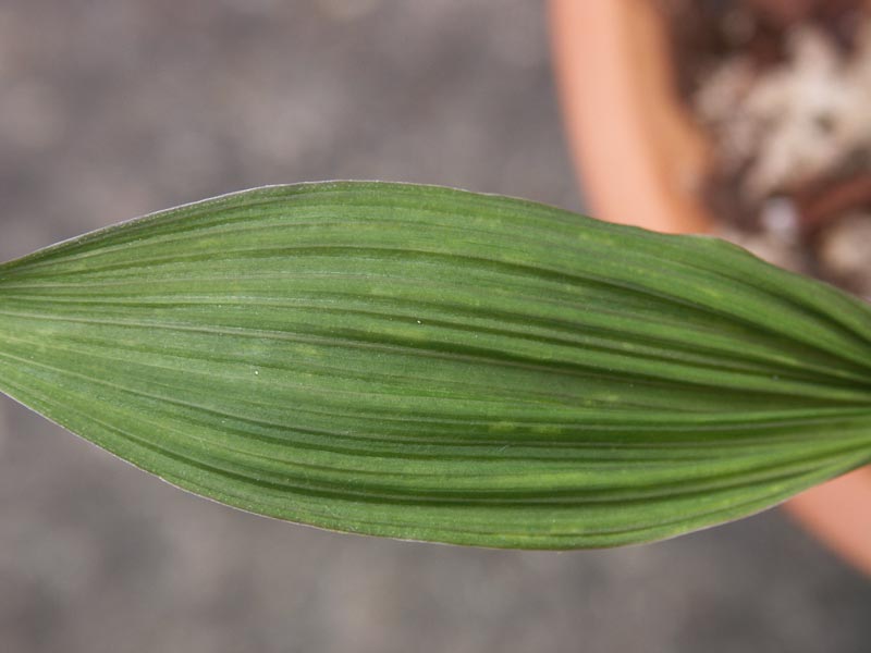 Přehnojení v minulém roce v podstatě nemohu vyloučit, protože rostlinu jsem minulý rok dostal. Takže pahlíza mohla být pochopitelně od původního školkaře vyhnojená (první foto bylo z června 2011). Loni dostala stejné hnojení jako ostatní mé rostliny. Přikládám dnešní foto. Je zde vidět, že skvrny jsou v daleko menším rozsahu než vloni, ale pořád jsou patrné a není vyloučeno, že se s plným rozvynutím listů znásobí. Pochopitelně to může být ještě přelitím zásobních látek z loňské původní pahlízy do nové, ale pochybuji o tom. No, kytka zůstane ještě letos v izolaci a na dietě, ale jestli se to objeví příští rok znovu, nebo jestli budou skvrny v průběhu roku přibývat tak poletí K.