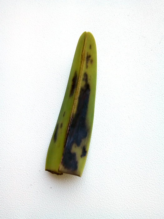 Prvý krát som sa s tým stretol min. rok na C. dowiane auree - rástli 2 nové phľzy. Najprv sa to objavilo na jednej - malý, v priemere cca 1,5 mm fľak. Žiaľ, následujúce 2 dni som sa nedostal k tomu,, aby som mohol odrezať napadnutú časť listu. Výsledok na priloženej fotke ... Skončilo to tak, že jednu phľzu som musel rezať do 1/3 (tá našťastie to "rozdýchala" a ešte dorástla), druhú som ale musel o pár dni rezať do 1/2 (tá už to neprežila). Tento rok to isté na C. fabii, ale nie na špičke - tesne pri phľze.
