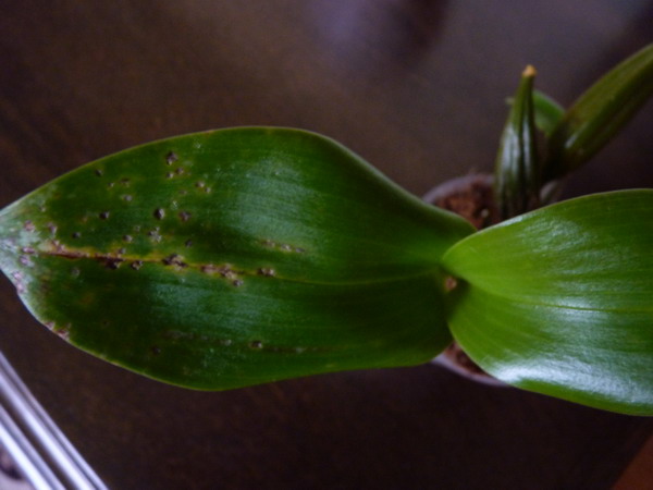 A tohodle je mi líto nejvíc: kingidium deliciosum var.yelow. Jen poznamenám,že vitrínu mlžím každý den, vlhkost je tam 80-90% a žádná houba se mi tam neobjevila. Tyhle byly na parapetu, kde je v místnosti možná 50% vlhkost, nepřelévám je a nemůžu se toho zbavit. Prosím tedy zkušené, zda poradí. Na Dendrobiu vyrostl krásný zelený list a za chvíli se to na něm udělalo taky. Ještě poznamenám,že rostliny jsou v karanténě......Moc děkuji Věra