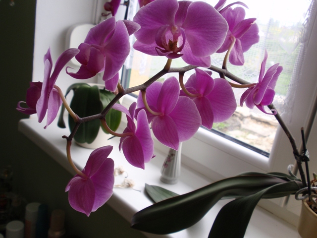 Znovu se obracím s prosbou, co to je s listama anebo s celou kytkou. Phal. Ten první je přesazen a listy jakoby usychají. Vyhodil dva květní stvoly. Druhý byl fakt nádherný, listy parádní, alespoň 30-40 cm dlouhé, květní stvol bohatě -chtěla jsem napsat okvětven, ale to je divný- tak obalen květama, a najednou listy zase jakoby usychají. Chystala jsem ho přesadit, ale začal kvést, tak čekám. Má někdo nějakou radu? Ď. Příloha:
