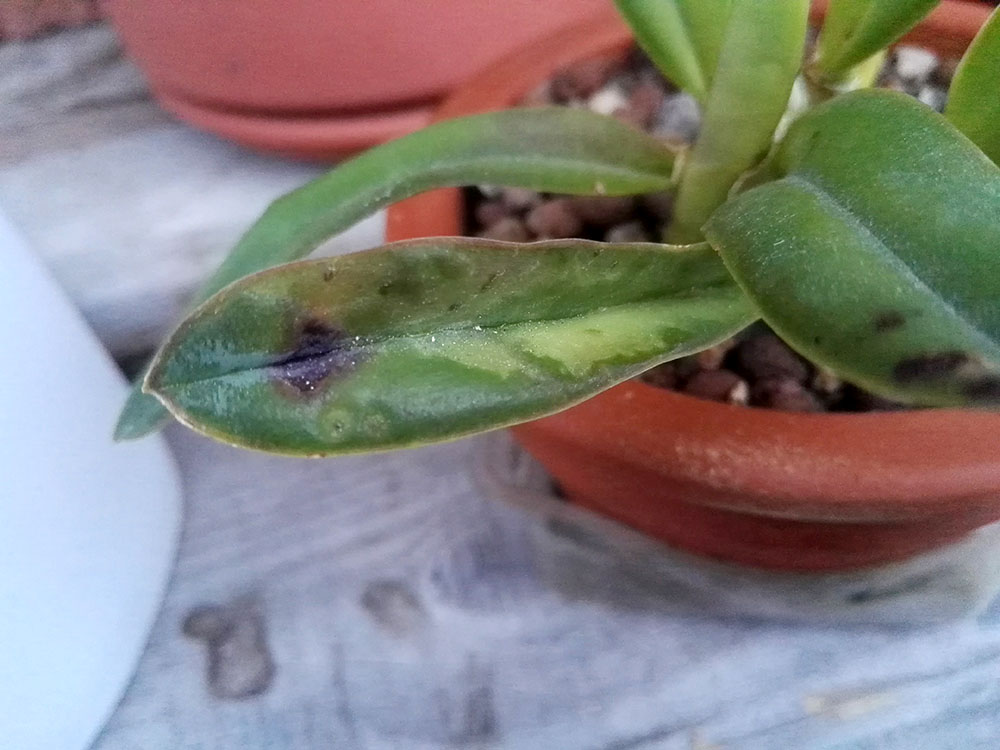 Já ji zaleju teprve až když začne rašit, do té doby ani kapku vody. Možná jestli se pamatuji u té Vaší to byl nevyzrálý výhon který vyrostl vyjímečně přes zimu (bez vody jen ze zásob starých pahlíz!) a tak snad to v tomto případě bylo dobře. Ale jestli ji v době klidu (po odkvětu před rašením) zase zalejete nebo budete pečlivě rosit tak budou konce listů opět odumírat a flekatět!!