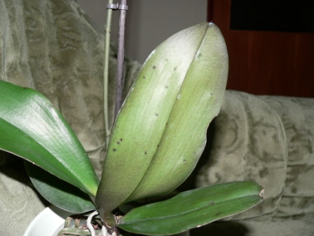 Je to foceno jen mobilem, nic lepšího nebylo. Na tomto phalu už opadlo několik listů a i kmínek je mírně flekatý. vypadá to, že se to šíří dál. Zatím jsem jí poradila, ať dá kytku do izolace.