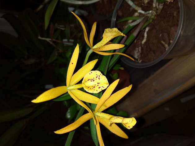 Děkuji všem za reakce. Fungicidy jsem ještě nikdy nezkoušel, ale asi s tím začnu. Rostlinu jsem včera již "poslal do kytek". Možná, že jsem se ukvapil, ale po pročtení diskuze o virózách jsem se docela zděsil. Já už jí s flekama koupil. Skvrny se tvoří pomalu, ale pravidelně i na mladších listech a postupně tmavnou. Takže to vidíte spíše na houbu. Docela mě nyní trápí, že jsem v létě nakoupil poměrně větší množství dospělých botanických cattlejí které vykazují různé skvrny. Jsou od pěstitele co má Katek obrovské množství a pěstuje je mnoho let. Tvrdí, že nechápe proč každý vidí za vším virózu. Zálivku hrnkovaných rostlin provádím většinou společně proléváním nad sudem. Takže představa, že mám zamořenou celou sbírku... raději nechci moc domýšlet. Přikládám pár fotografií zmiňovaných kytek co mám na zimu v práci. Asi vyčkám jak dopadnou nové výhony a pak budu dělat nějaké závěry. Na jaře budu provádět raději preventivní postřik jak fungicidy tak insekticidy.