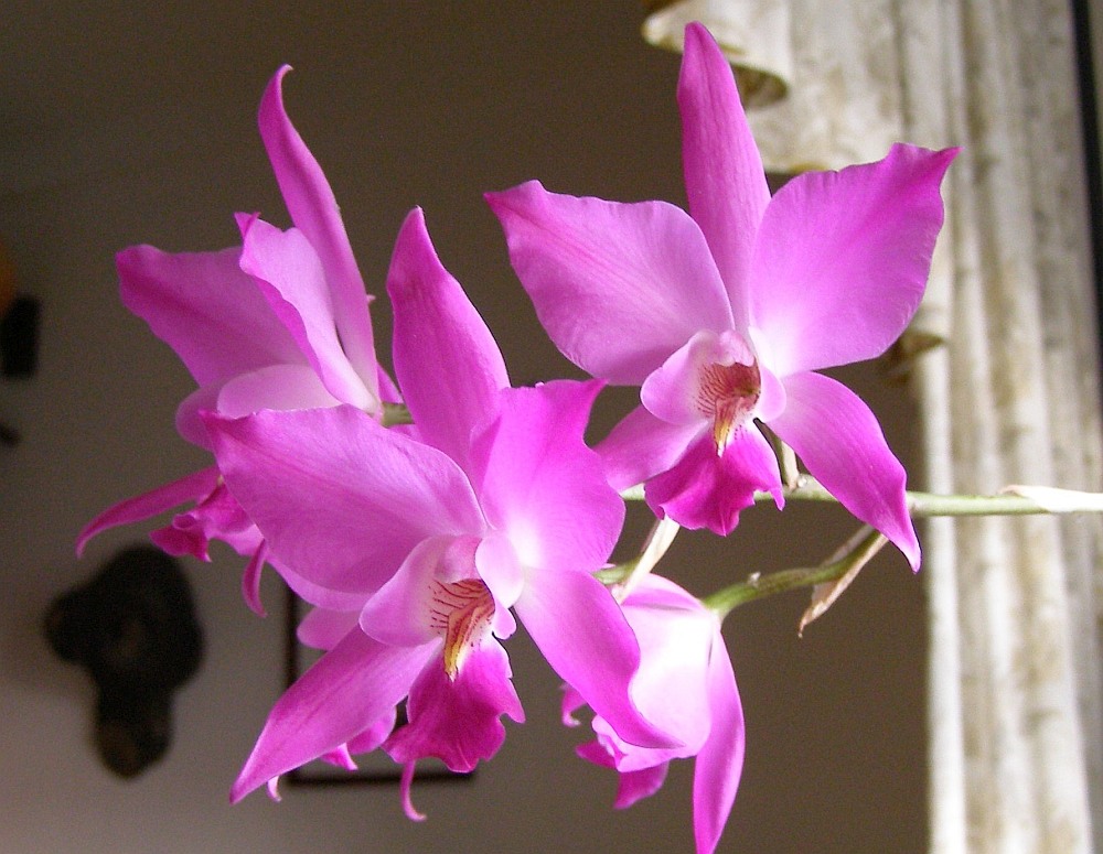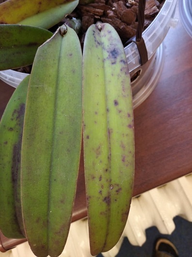 Dovolím si ještě přiložit fotku kvetoucí Laelia gouldiana. Za ní je list a na něm velké černé fleky ještě od původního majitele. Nejspíše také houbová choroba nebo snad zčernání po ožeru hmyzem. Budu se v tom muset zorientovat. Co se týká vody tak rostliny spíše suším a mám je v domě na parapetu. Takže žádná extrémní vlhkost.