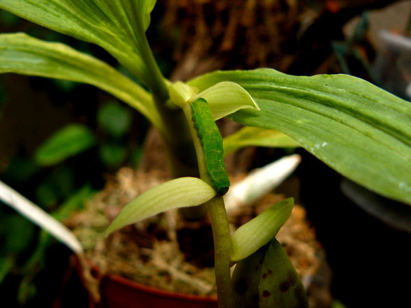 Míra píše: Tak letošní rok opravdu tropí hlouposti. Venku motýli nelétají, ve skleníku jsem také nic takového nezaznamenal a na květném stvolu Cynoches jsem si náhodou všiml této potvory. Jen mi nejde na rozum, kde se tam vzala. Tyto byvaji na pelargoniich, nenastehoval jste si do skleniku na prezimovani nejakou i s malou housenkou, jsou malo videt.