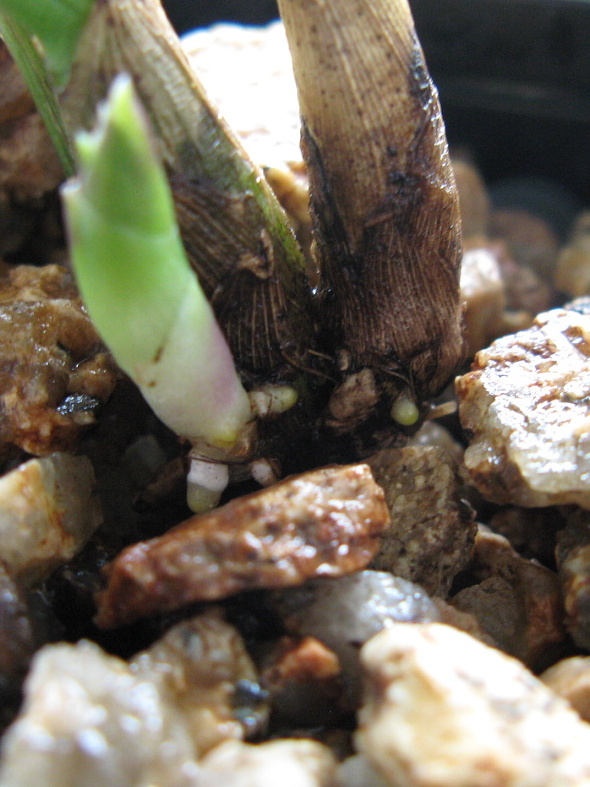 ještě dodatek - aleš dvořák mi říkal, že jeden náš slavný orchideář, tuším pan Gut, pěstoval takto rupicoly jenom na kamenech a měl úspěch.. máš jistotu, že ji nepřeliješ... to je myslím hlavní ohnisko problémů - přelití... oni jsou schopny chytit okamžitě plíseň... tady je celá rostlina:  a tady je detail nového výhonu: