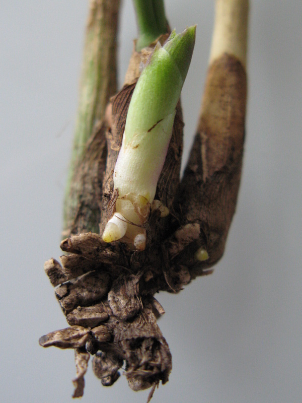ještě dodatek - aleš dvořák mi říkal, že jeden náš slavný orchideář, tuším pan Gut, pěstoval takto rupicoly jenom na kamenech a měl úspěch.. máš jistotu, že ji nepřeliješ... to je myslím hlavní ohnisko problémů - přelití... oni jsou schopny chytit okamžitě plíseň... tady je celá rostlina:  a tady je detail nového výhonu: