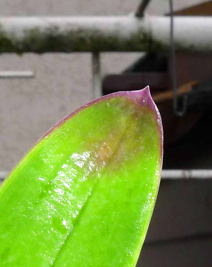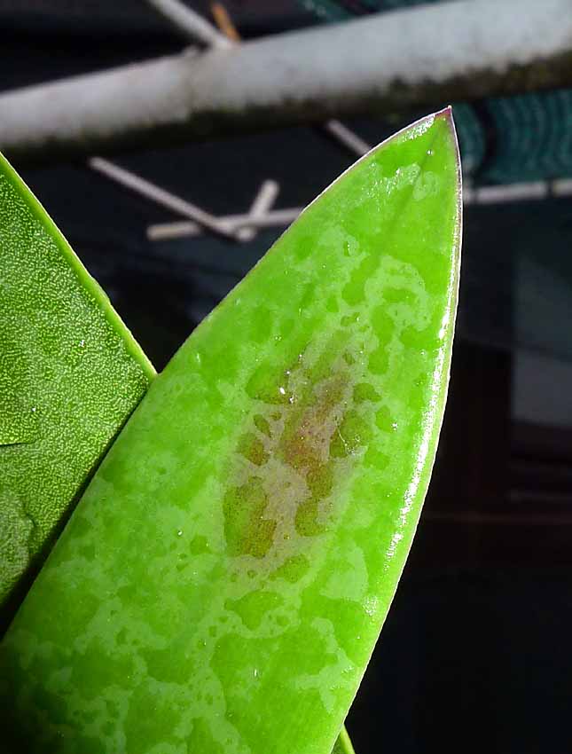 Jednou se tu řešily tyto purpurové skvrny na listech Laelie speciosy či Cattleya. Tuším že se dospělo k závěru že jde o skvrny z nedostatku nějakého prvku. Rostliny jsem měl již bez skvrn. Nyní jsem je přenesl na více osluněné místo a skvrny se zase objevily a to na nejvíce exponovaných místech listů. Rostliny jsou hnojené plným orchidejovým hnojivem a mají zdravé kořeny, takže snad prvků mají dostatek. Mám z toho pocit jako že to zfialovění je jakási obrana ještě před totálním spálením sluncem. Na jaře rostlina zfialoví celá a v létě zase zezelená- více stíněná.