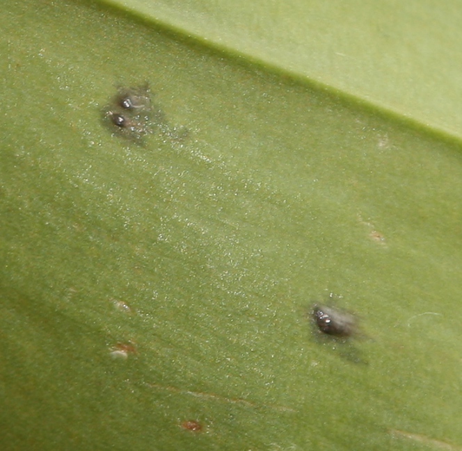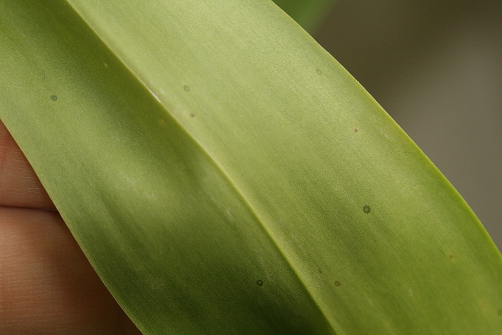 Už minule som si všimol na listoch Cymbidia pár presvitajúcich mini bodiek. Ale dnes som si ich všimol aj na listoch Miltonidia, a to vo väčšom rozsahu. Tak som poriadne prezeral rastlinu a našiel som nevítaných hosťov. Navštívili aj Miltoniopsis. V prevažnej väčšine ide o malé (1-2 mm) bodky na listoch, ktoré presvitajú v protisvetle. To sú už vycicané miesta. Uprostred každej body je mikro čierna bodka. Na Miltonidiu som ale našiel zrejme dospelé jedince. Prikladám fotky. Vie niekto, o čo ide a ako proti tomu účinne bojovať ? Ďakujem.