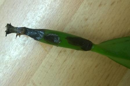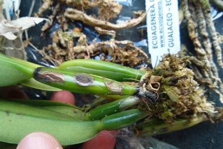 Dobrý den, může mi prosím někdo poradit způsob léčení (pokud je možné?). Koupil jsem v Ládví od Ecuagenery Cattlea maxima. Když jsem ji doma vybalil, všiml jsem si černohnědých fleků na pahlízách. Zasypal jsem je prachem z dřevěného uhlí, ale včera pahlíza upadla. Moc nadějně to nevypadá, co? No, jsem trouba, že jsem si balíček nerozbalil a neprohlédl hned...