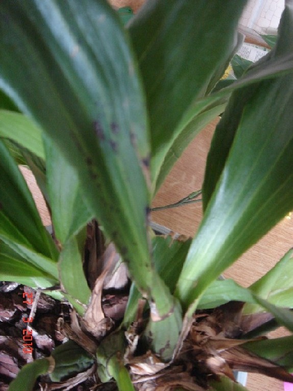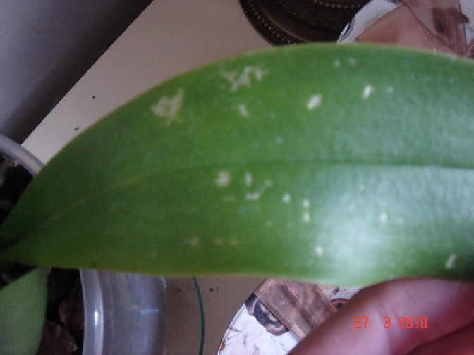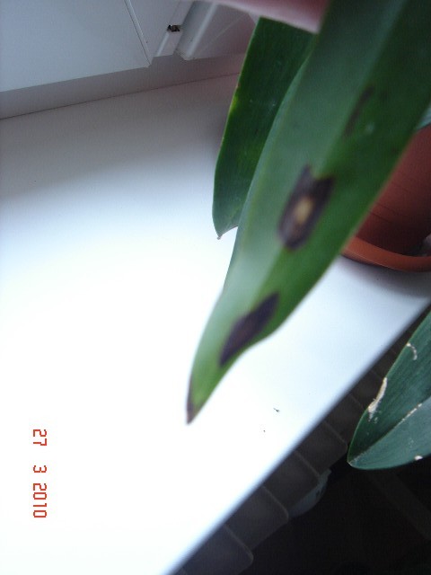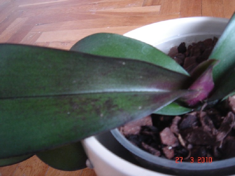Phalaenopsis 1,2- rastlinka c.1 ma listy tvrde,druhej listy ovisli a zmakli ale na obidvoch mam nejake tmave flaky, zospodu su listy dokonca az tmavofialove. Su na nich aj male biele mapky, ale to si nie som ista, ci je nejaka choroba, ci to nie je iba tym, ze som ich zacala rosit a usadza sa na nich vodny kamen?