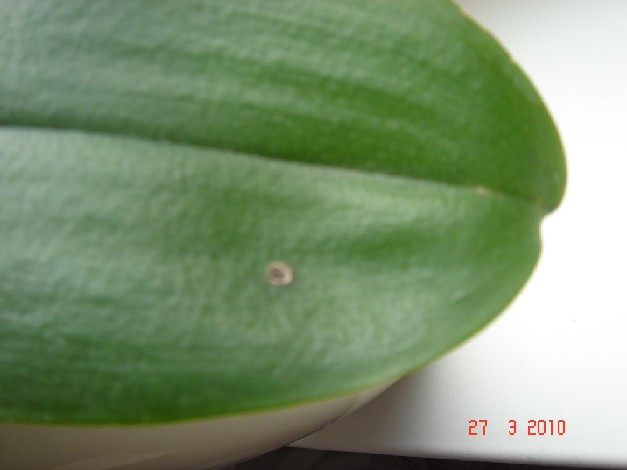 Phalaenopsis 4-krasne kvitne,listy su tvrde,farbu maju dobru, ale na jednom z nich sa spravil zvlastny flak, zospodu akoby diera.