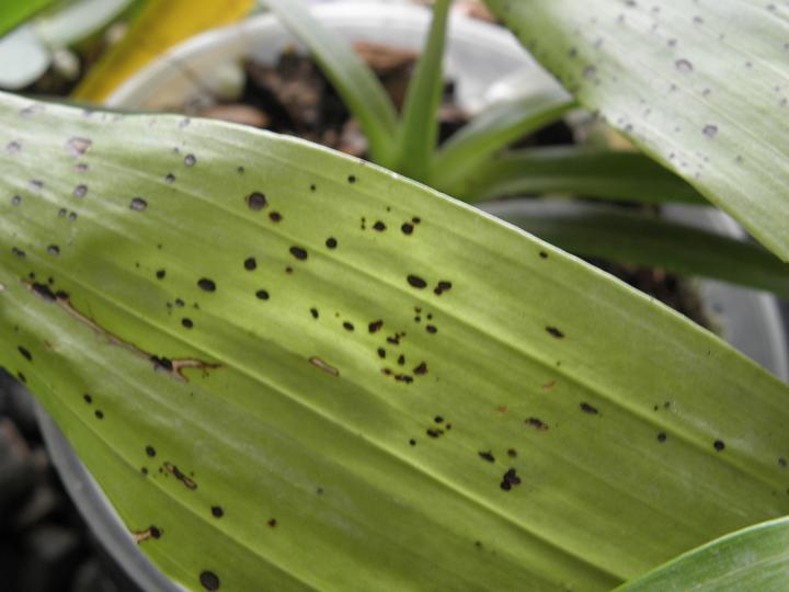 Ivag tak na té druhé fotce se mi zdá,že by to nějaké ty potfory mohly být,mě to připadá,že ten list něco vysává,nemáš ho lepkavý?Já mám černé tečky,posílám fotku,ale je to list Coelogyně,Cambrii jsem už darovala.Tak zkus taky posoudit.