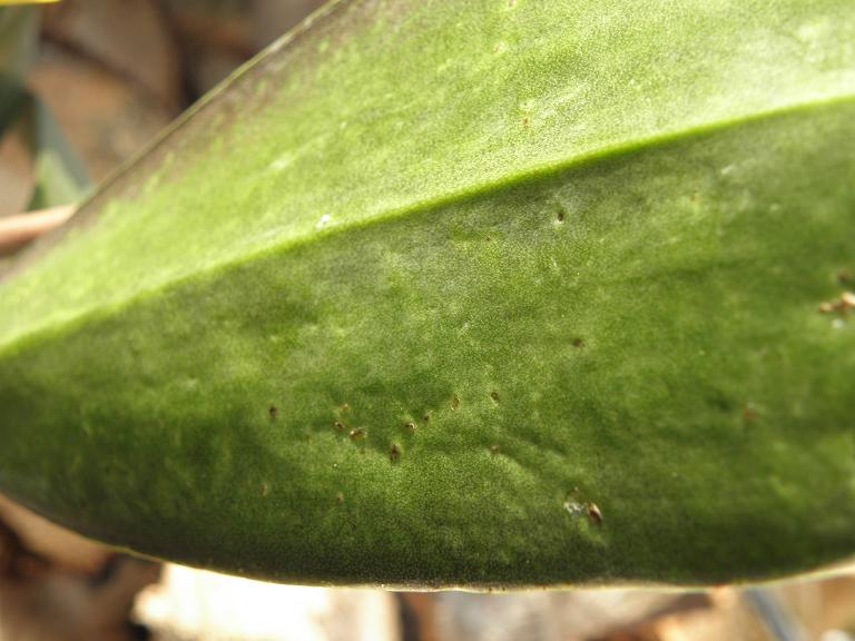 Hani,děkuju,tak jsem ten falenák okukla znovu a svilušky to nejsou,ta fotka nejspíš klame,žádná stopa po pavučinkách a malinkých oranž.broučkách,nic se na listu ani nehne.No a ten bílý asi teda ten červec taky ne,měla jsem ho na cattley,tak jsem měla čest ho poznat osobně.Jsou v tom listu vytlačené dlouhé hluboké jamky,které jsou zakončené právě tou tečkou na konci.Já fakt nevím,radši ho vezmu nůžkama než se mi to rozmnoží dál.