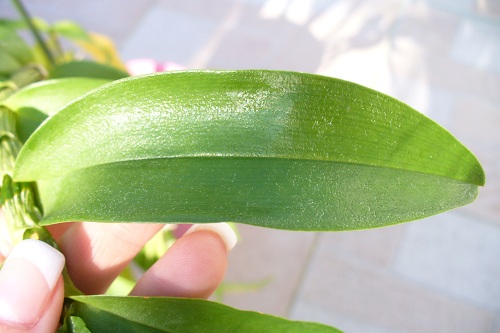 Též mám prosbu, zdali někdo nevíte, co to způsobilo. Je to na Dendrobium phalaneopsis, list je normálně zelený (foto nějak chytlo jiný odstín). je to rub i líc listu a je to, zdá se, stejné. |