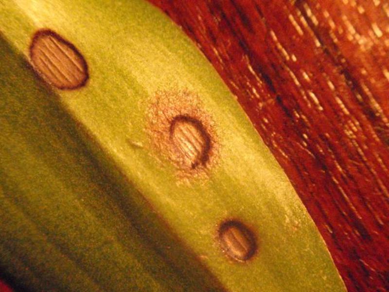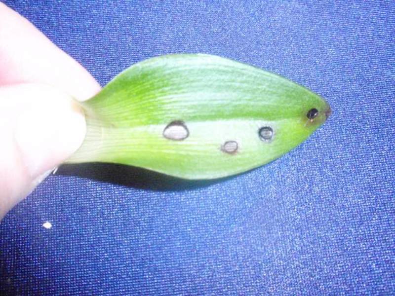 Houbovka. Na jednom listu jsem ji taky měl, v té době jsem dost rosil, a voda zatékala do listů vyvíjející se pahlízy, ale hlavně netvrďte že Vy máte tu kytku v suchu:-) |