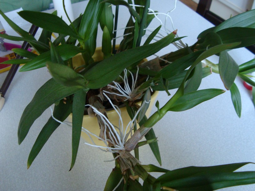 Vaše rostlina je pravděpodobně Dendrobium Berry Oda, což je hybrid od Dendrobium kingianum. Rostlina tvoří keiki místo květů v případě příliš "dobrých" pěstitelských podmínek. Pro kvetení potřebuje období chladnějších teplot a snížené zálivky. Keiky, které na rostlině jsou, je možno již oddělit a zasadit do malého květináčku do kůrového substrátu a pěstovat stejně jako velkou rostlinu. Jemně se s keikou zakroutí a ona se celkem snadno oddělí. Po oddělení a zasazení několik dnů nezalévat, aby se rána zacelila. Ovšem tuto operaci bych již raději nechala na jaro. Jinak když je na rostlině necháte, pokvete i "v druhém patře" za dodržení výše uvedených podmínek. Mateřskou rostlinu přesadit možno, i když obecně dendrobia mají ráda raději menší květináč a těsnější prostor kolem kořenů. I toto bych už nechala na jaro. Teď by právě mělo přijít výše zmíněné období klidu.