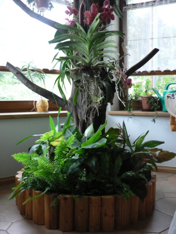 Všechny moc zdravím a posílám pár fotek jak pěstuji orchideje já. Kmen je z habru a je ukotvený ve stropě a v podlaze ložisky, takže s ním lze otáčet.