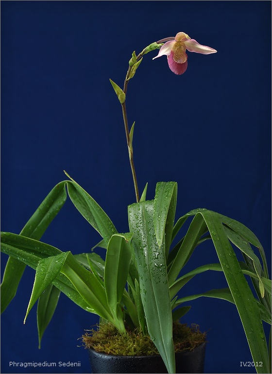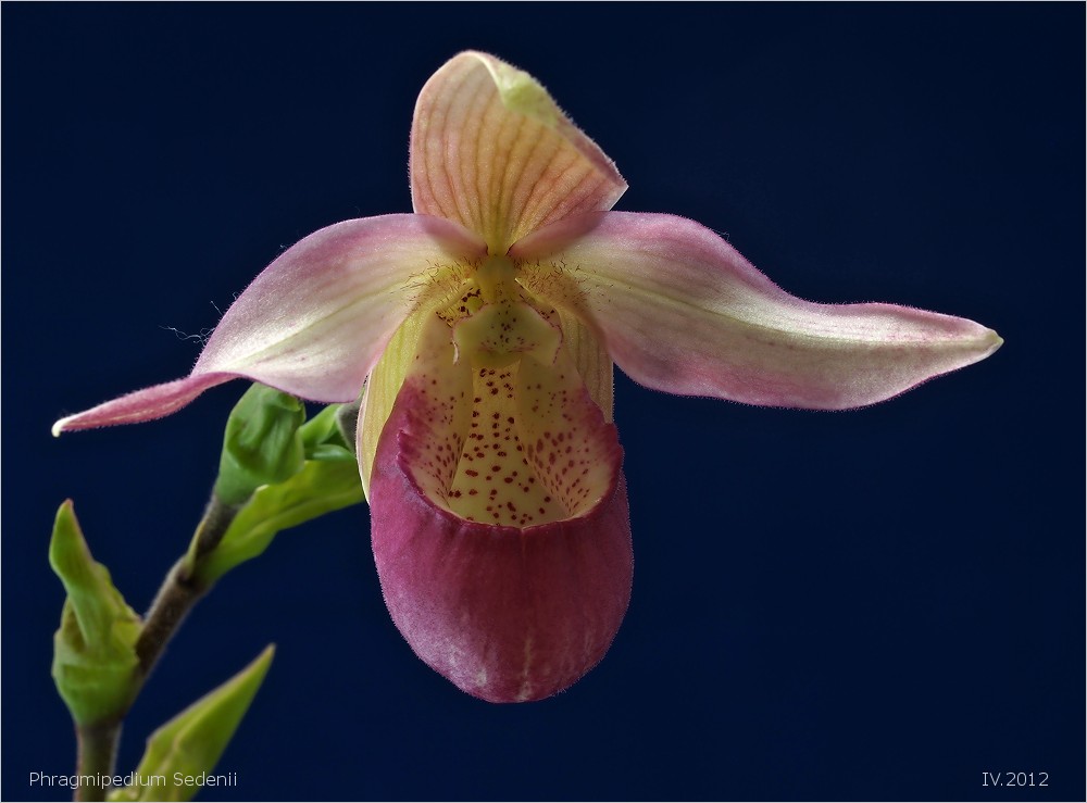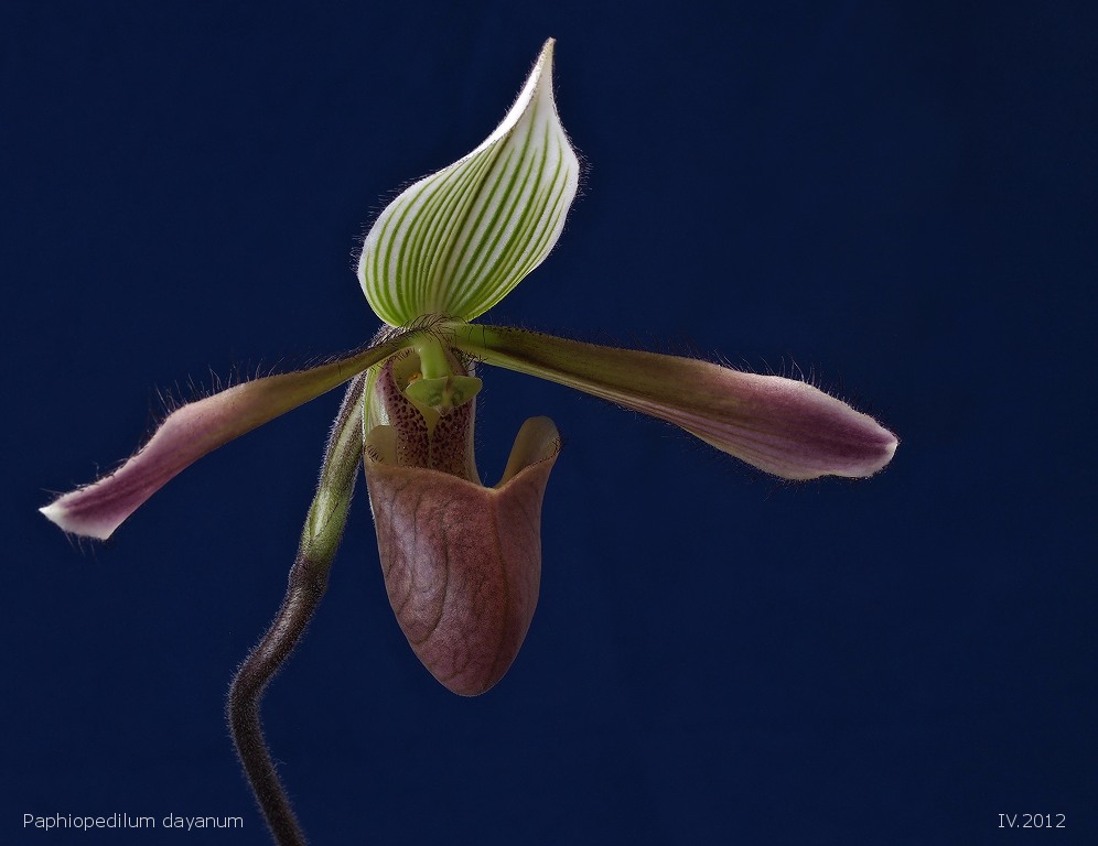 Zpráva o stavu kvetení... Phragmipedium Sedenii (prim. hybrid Phr. schlimii x Phr. longifolium) a Paphiopedilum dayanum na rozloučenou - zase trochu jinak... Phr. Sedeni bylo prvním pokusem Johna Sedena o křížení orchidejí vůbec ,a to už v roce 1873. Dovedu si představit,co to udělalo s jeho nervovou soustavou...