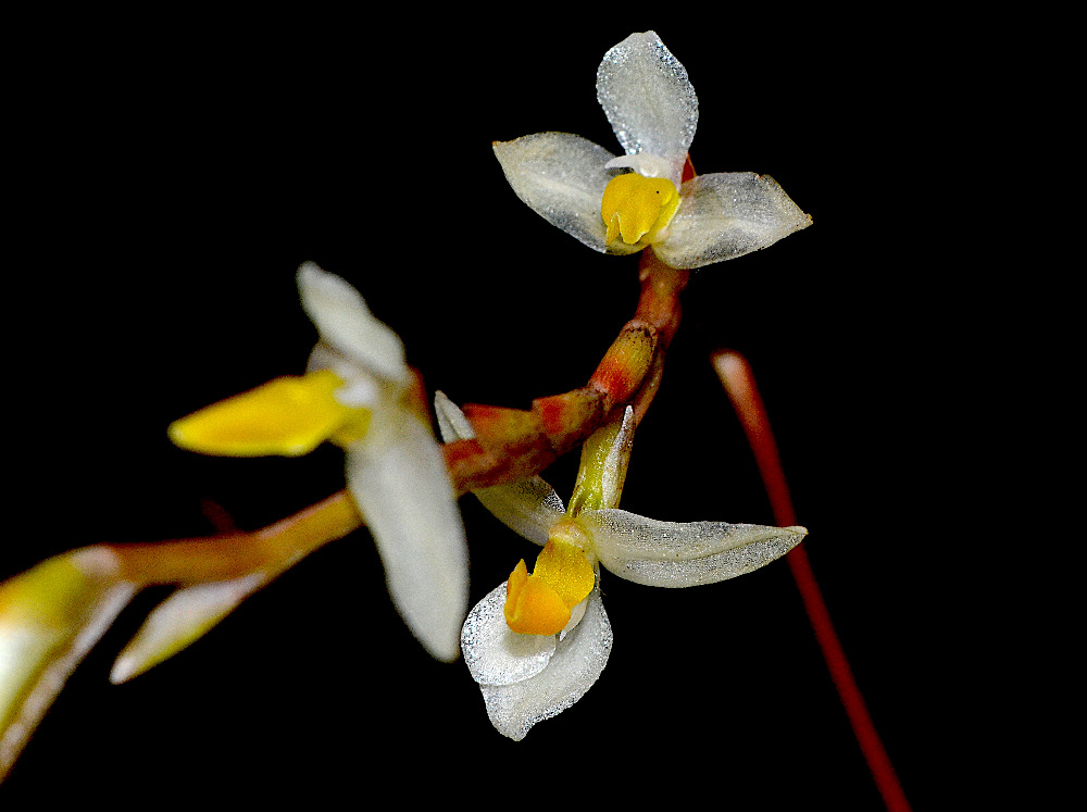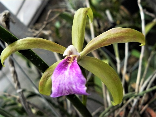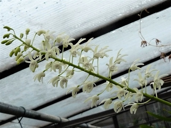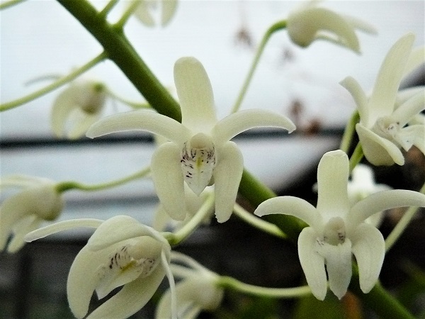 Koupeno na Výstavě ve Vídni snad od Curlina jako Dendrochilum sp. Na netu se snad nejvíc podobá D. alpinum. Má někdo lepší určení? Jak už u dendrochil bývá, roste dobře. S prvním květem si dala na čas. Kvetla až jako statný trs pahlíz.