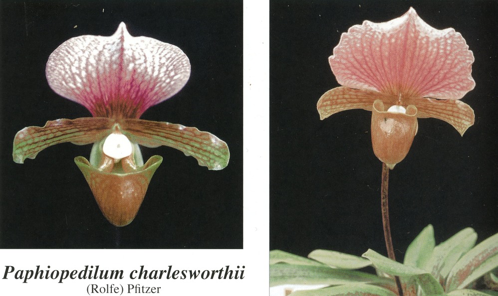 Úhel pohledu. Mluvili jsme o tom s HAKI v souvislosti s nakvétajícími pafíky,tak dávám jeden příklad. To charlesworthii vpravo je typické,takhle ho znám z většiny fotek.Kompaktní,široký dorzální sepal,štěrbina mezi sepalem a petaly téměř není vidět... Ale pokud se podíváte pozorně,je focené téměř z podhledu (všiměte si postavení staminodia) oproti tomu vlevo...