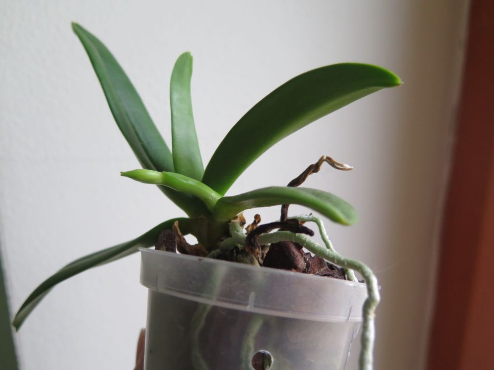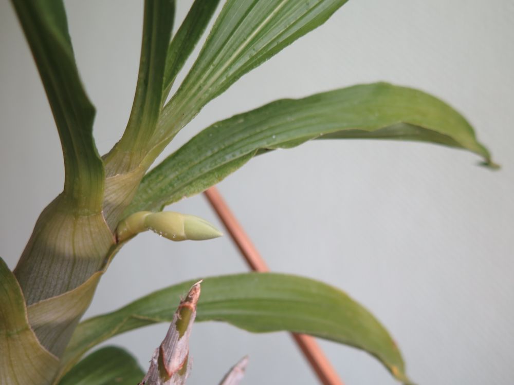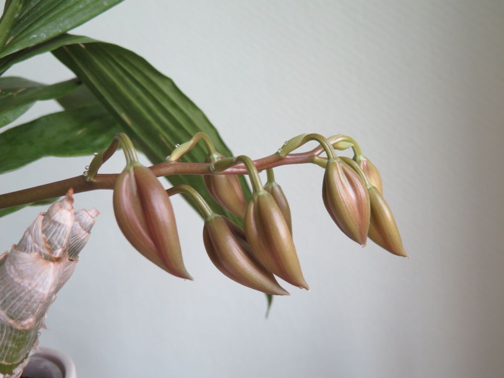 Dnešní překvapení - Liparis viridiflora. Tuhle kytku mám snad 6 let, možná déle. Neroste nijak zvlášť dobře. A loni mi uschla prostřední pahlíza, kytka se pak rozpadla na dvě části. Jednu jsem dala Evě, snad jí poroste líp. Ale dneska jsem našla mezi pokroucenými listy stvol. Jsem zvědavá, jestli to dotáhne. Bylo by to první kvetení.