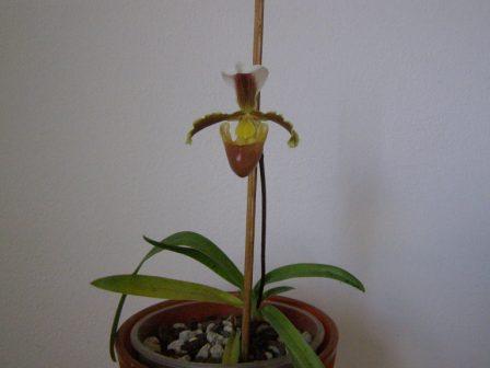 Včera mi vykvetl nový můj přírůstek, který jsem si pořídila na jaře. Nejdřív to nevypadalo, že si budeme rozumět. Tak šel začátkem května nekompromisně ven a takhle to dopadlo. Paphiopedilum coccineum - syn. Paphiopedilum barbigerum var. Lockianum Příloha: